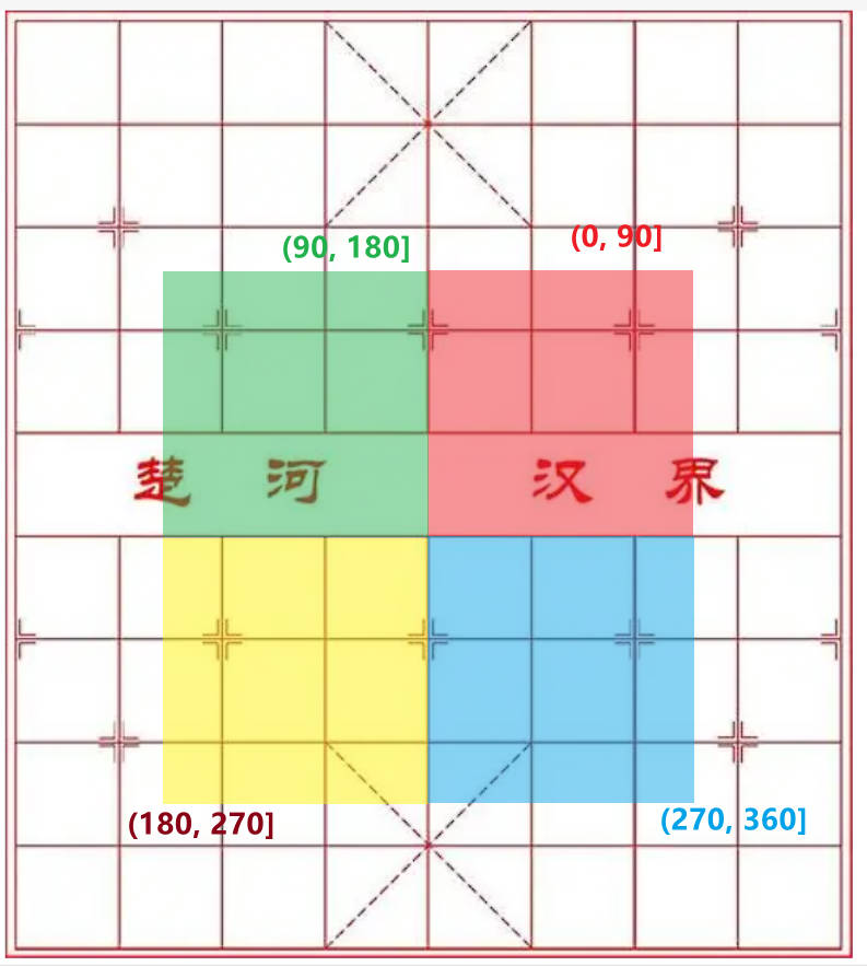 1.以马当前位置为原点,将周围分成四个象限。以逆时针来算,保持左开右闭的原则。